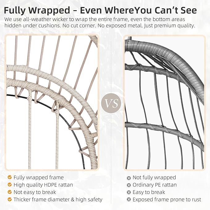 - 【Upgraded HDPE Wicker – Superior to PE Rattan】Crafted from high-density polyethylene (HDPE) wicker, this material is far more weather-resistant, UV-resistant, and durable than traditional PE rattan. HDPE wicker stays flexible, vibrant, and crack-free even after long-term outdoor exposure. It’s water-resistant, easy to maintain, and perfectly suited for year-round outdoor enjoyment.