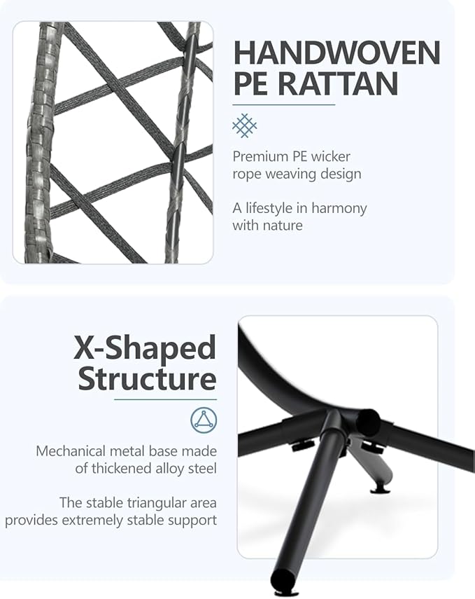 - ★ Built to Last, Rain or Shine: The SWITTE hanging egg chair with stand is made for durability. Its sturdy aluminum-steel frame, rust-resistant finish, and weatherproof wicker are designed for outdoor use but look great indoors, too. The strong base keeps this egg chair swing steady, holding up to 350 lbs